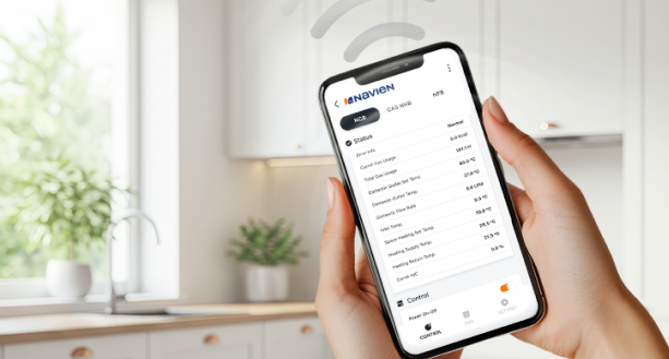 Controla tu equipo desde tu celular con NaviLink™. Monitorea la temperatura, enciende o apaga tu sistema y recibe notificaciones, todo desde la app disponible para iOS y Android.